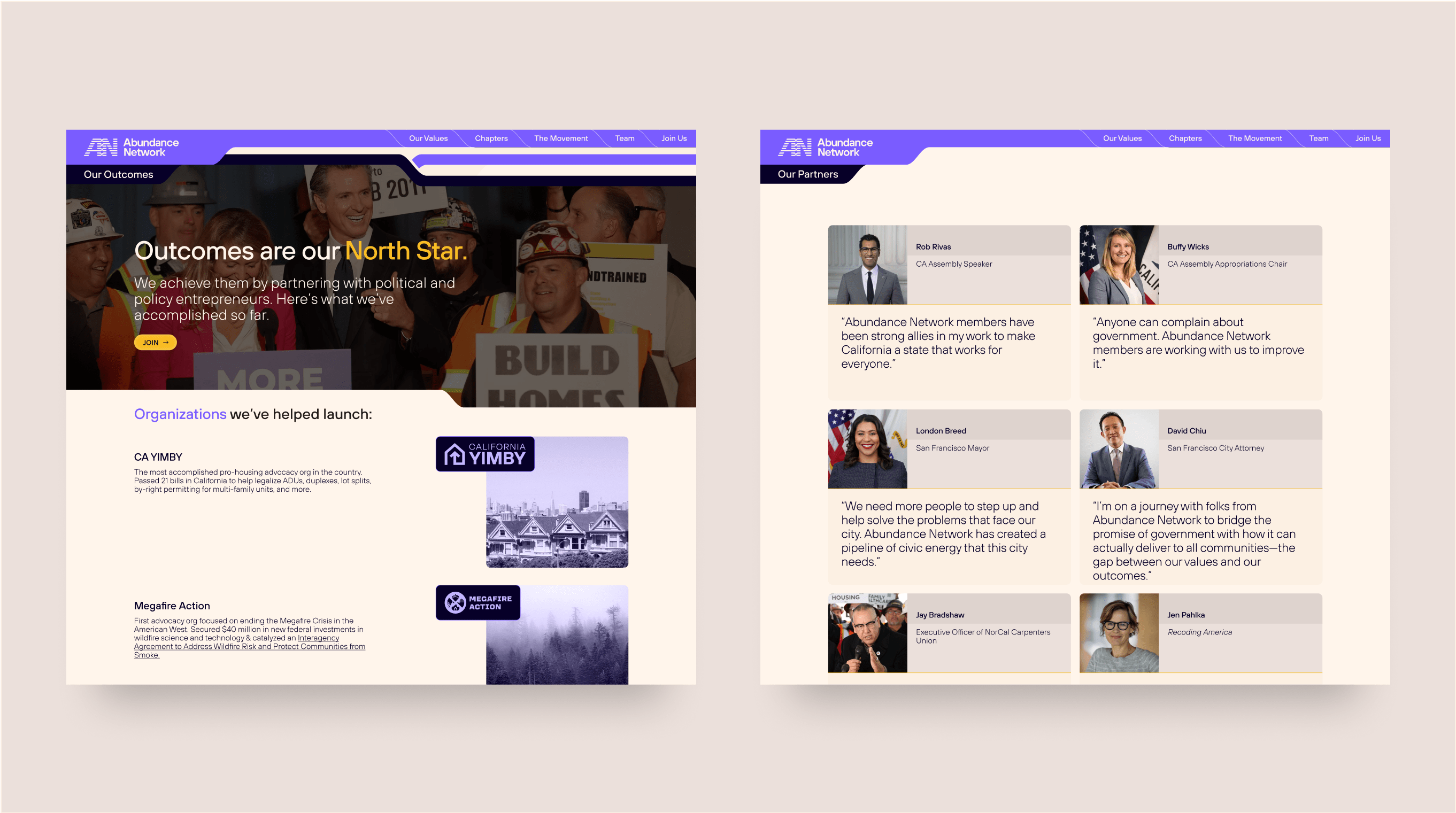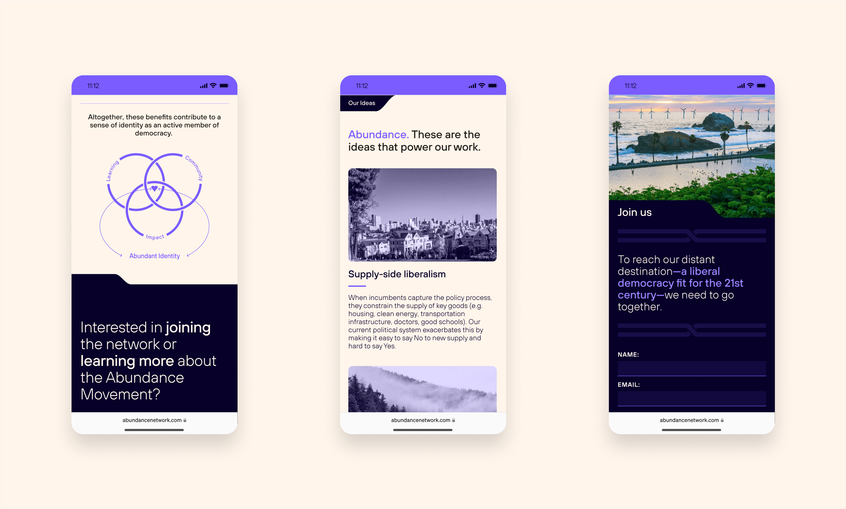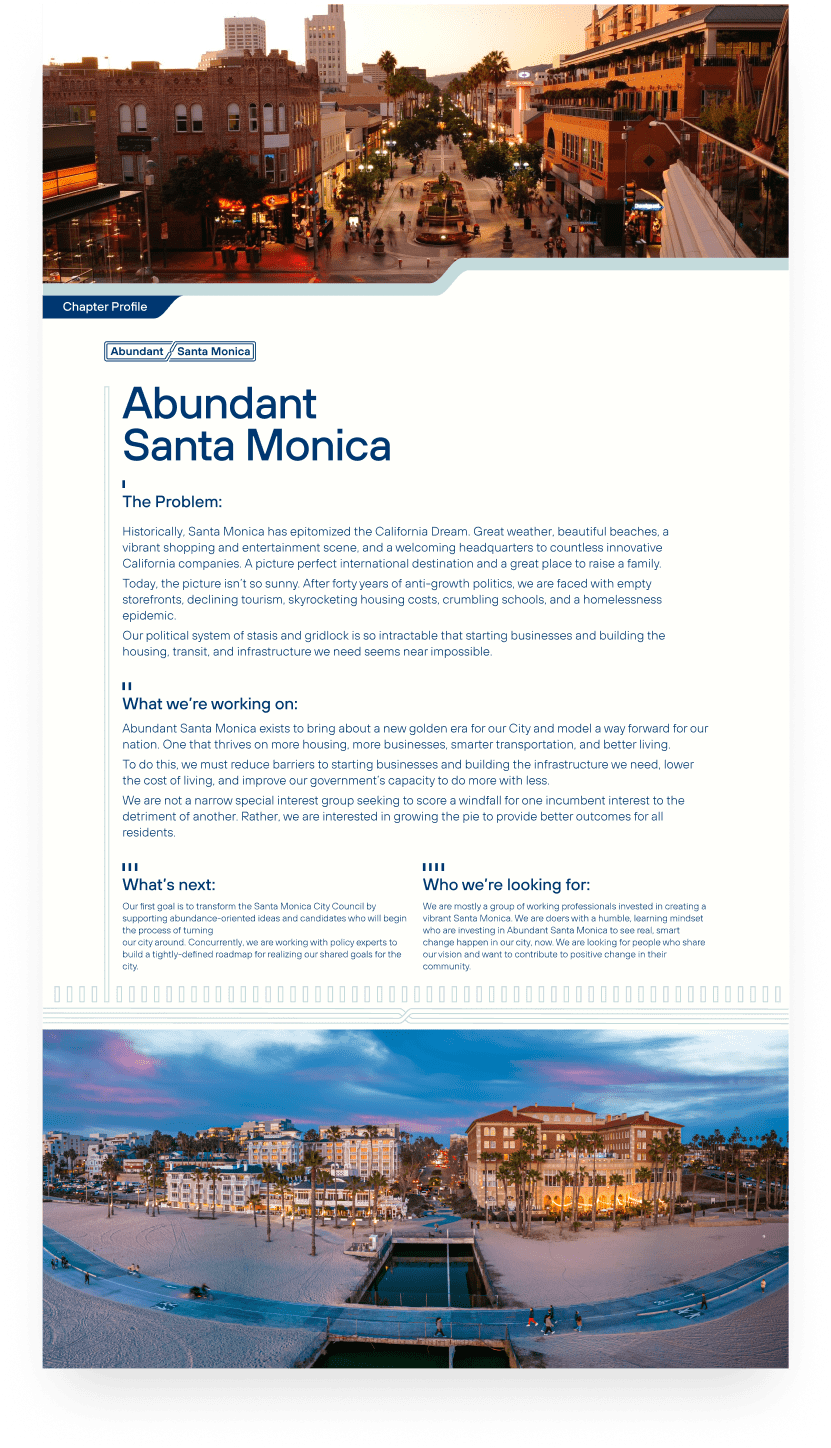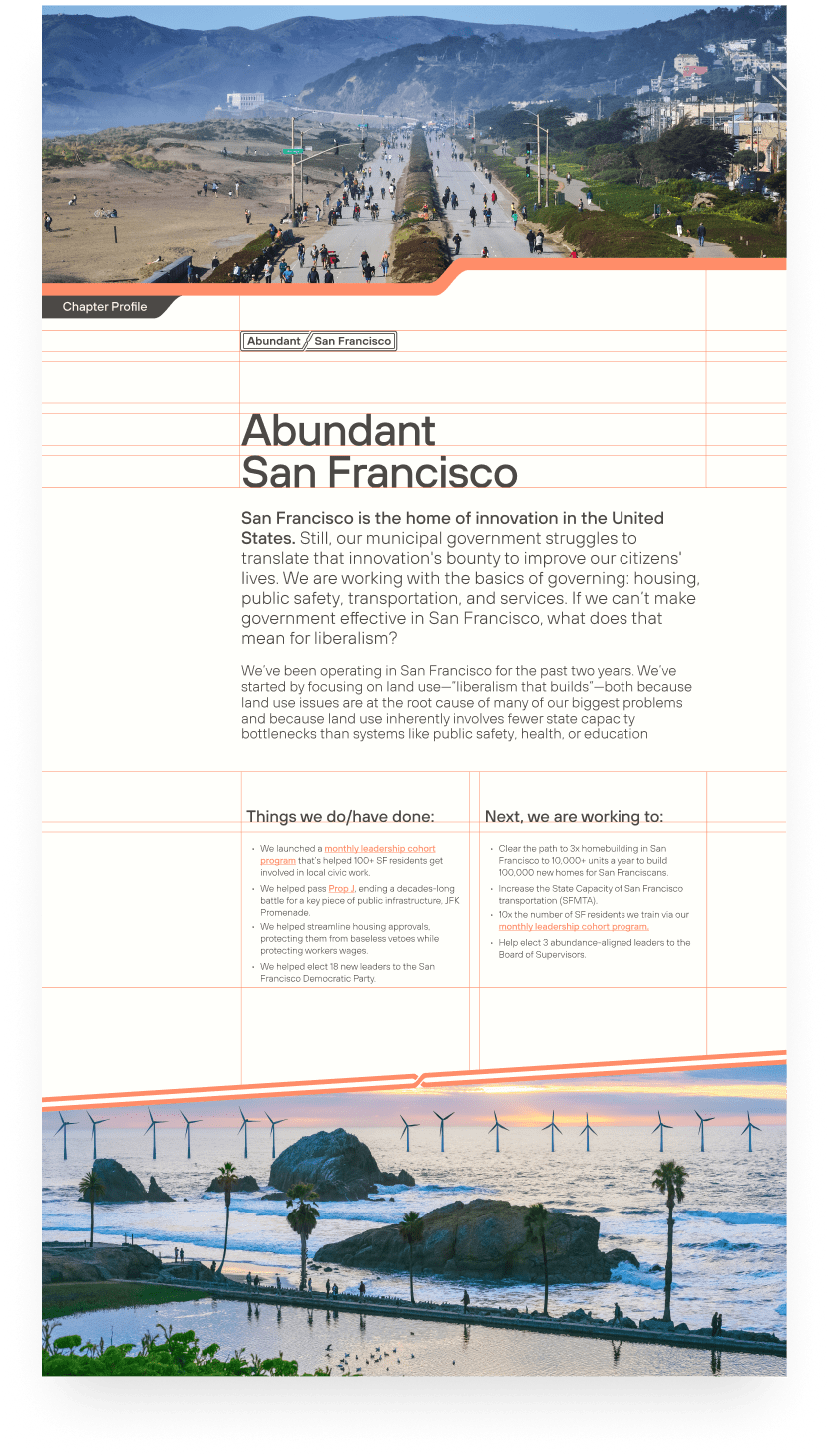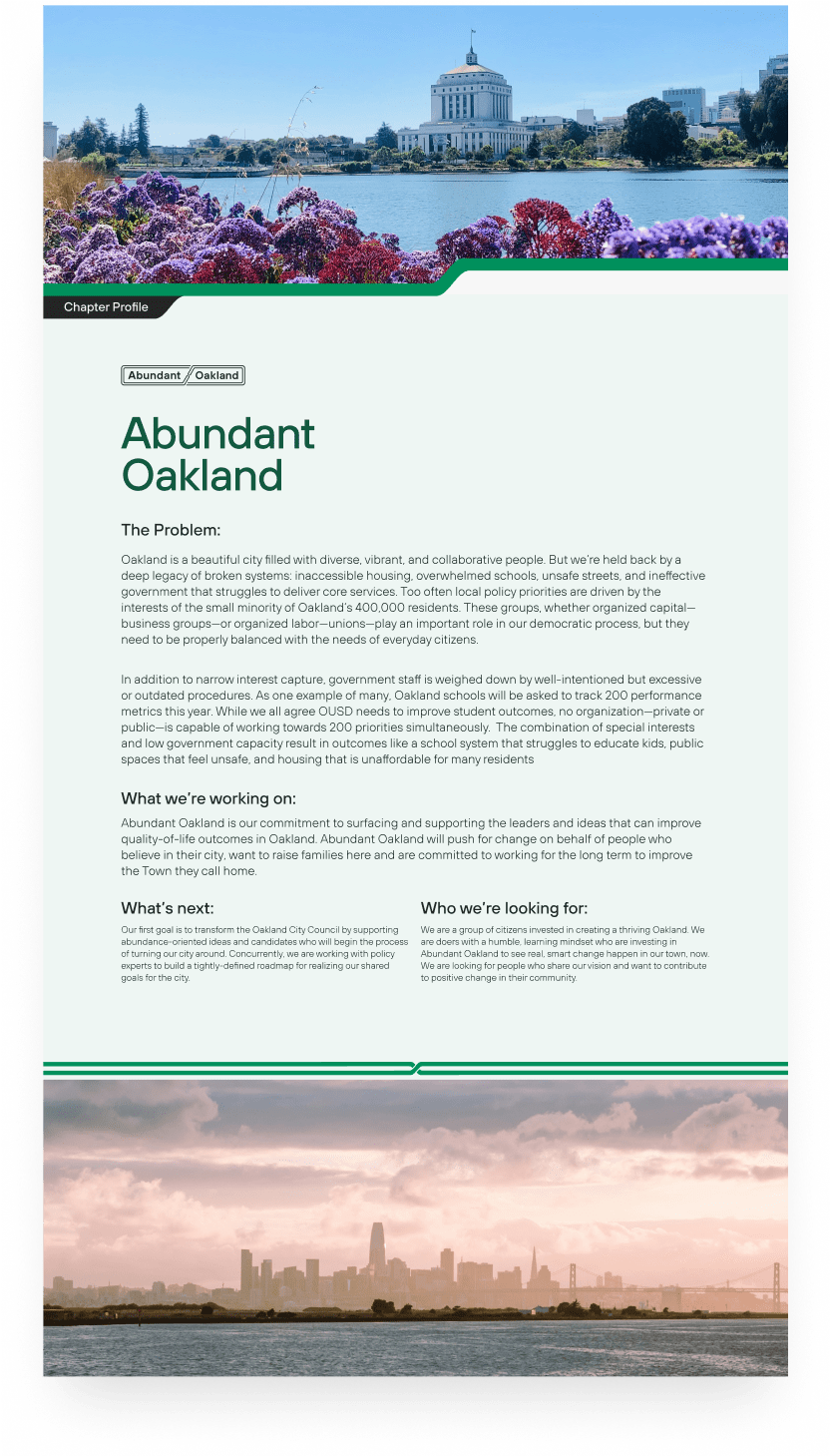 The design brief for Abundance Network (AN) focused on creating a dynamic and engaging brand identity that reflected the movement’s mission to reshape key sectors like housing, transportation, education, and public spaces in the U.S. The brand needed to resonate with "urban elites"—millennials who believe in the power of government to drive change—while remaining accessible to a broader political audience.