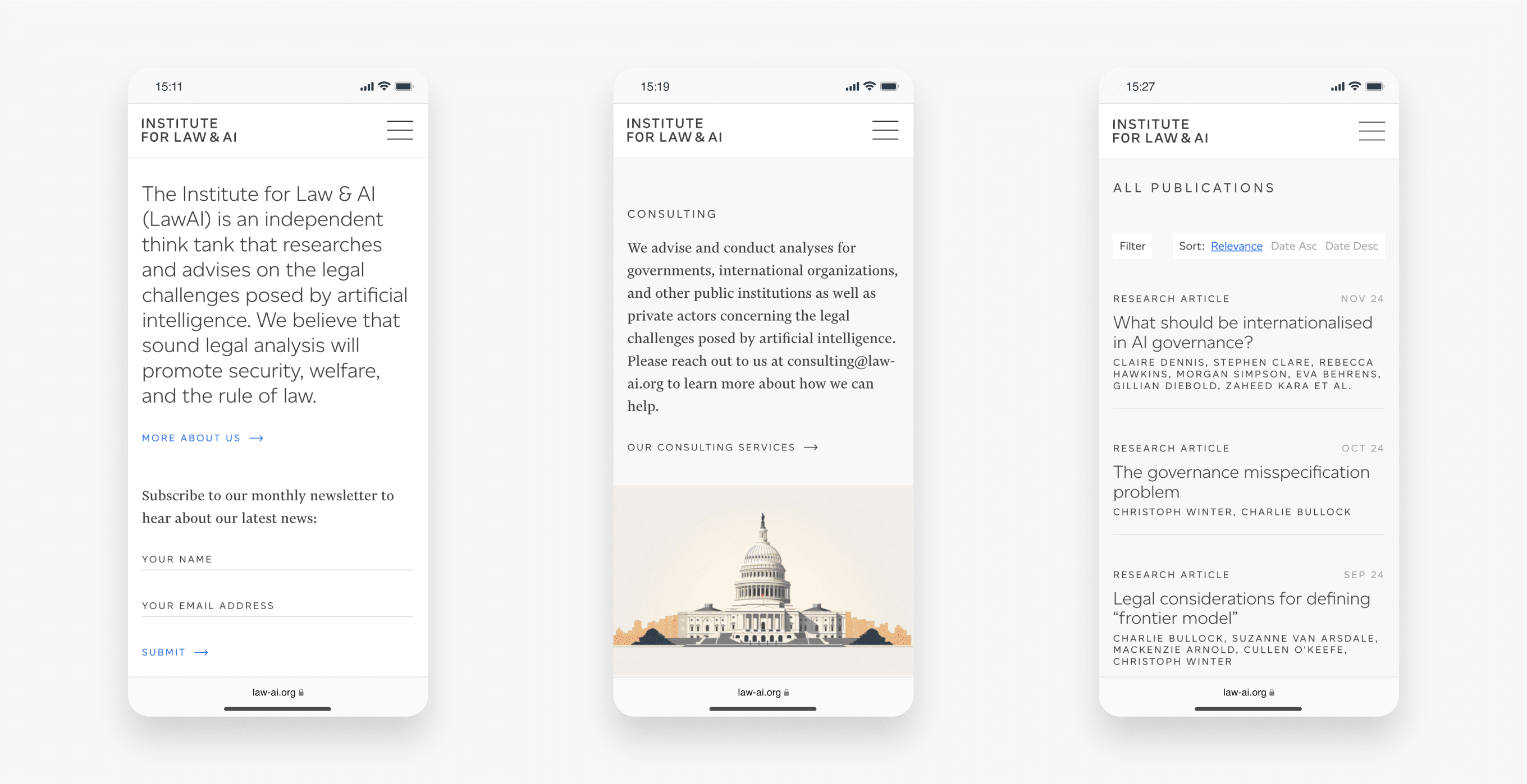The Institute for Law & AI is a think tank composed of legal researchers who offer policy and legal analysis on matters concerning advanced AI systems. It aims to inform and advise policymakers at the intersection of AI and the law, with the ultimate goal of mitigating risks and promoting safety, accountability, and well-being.