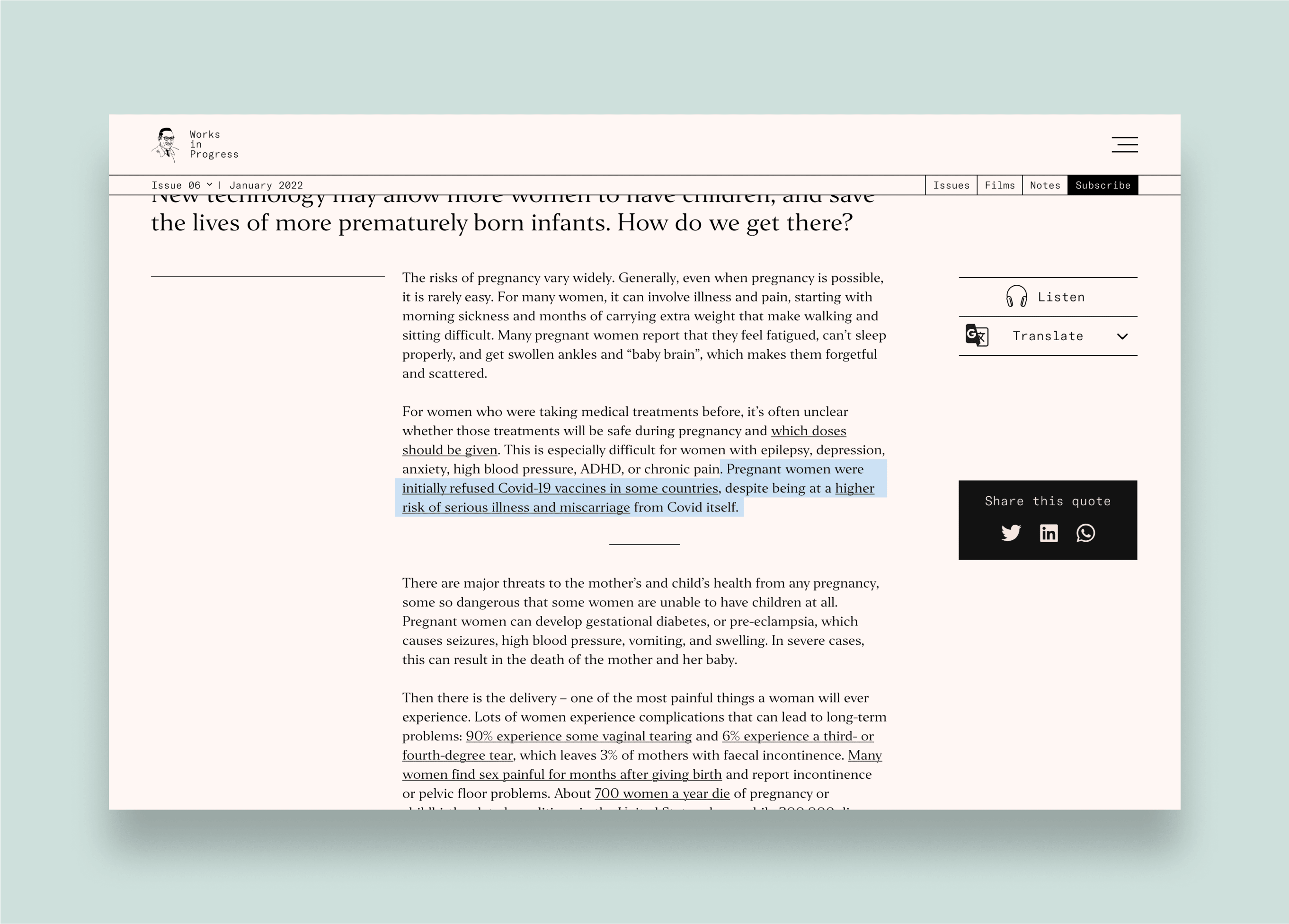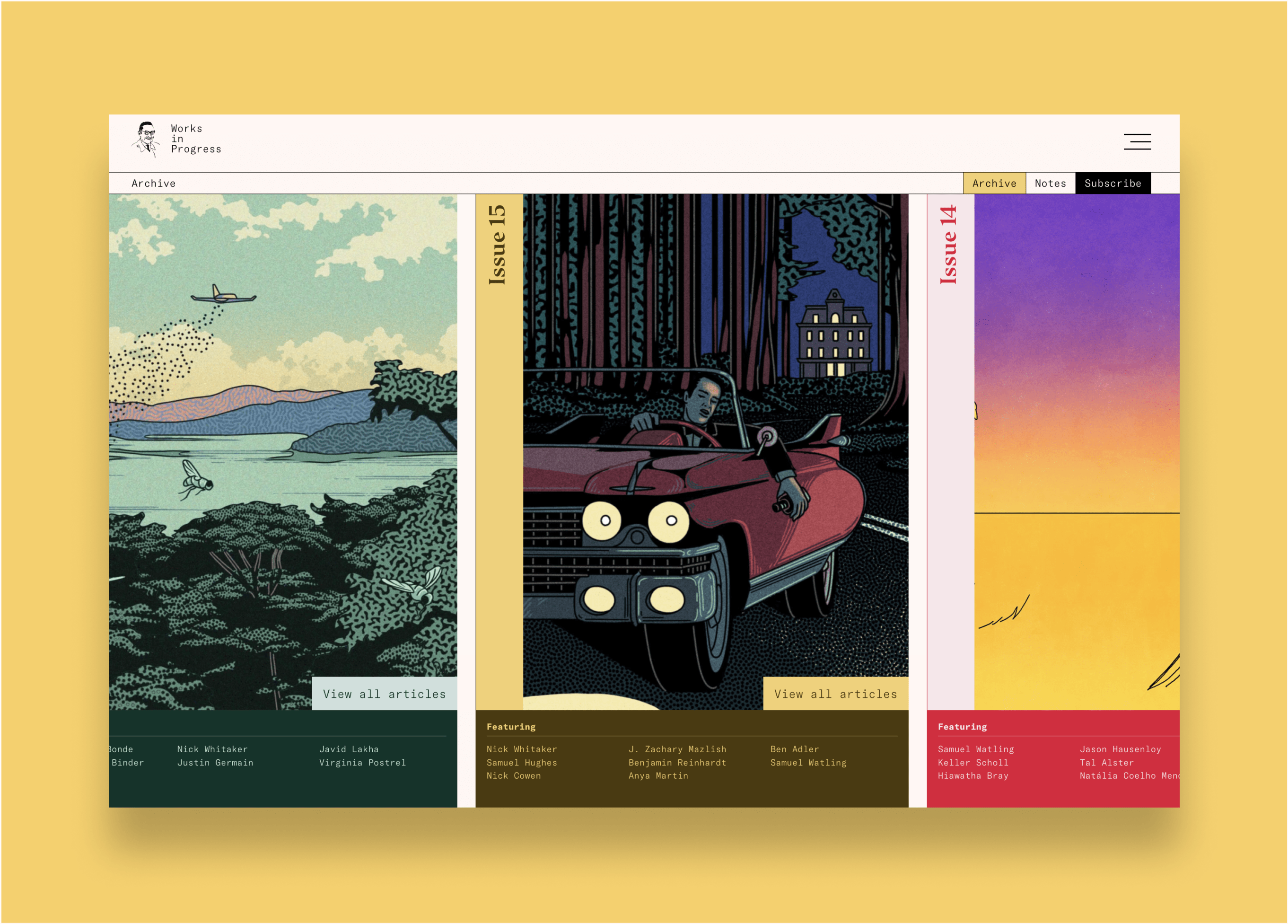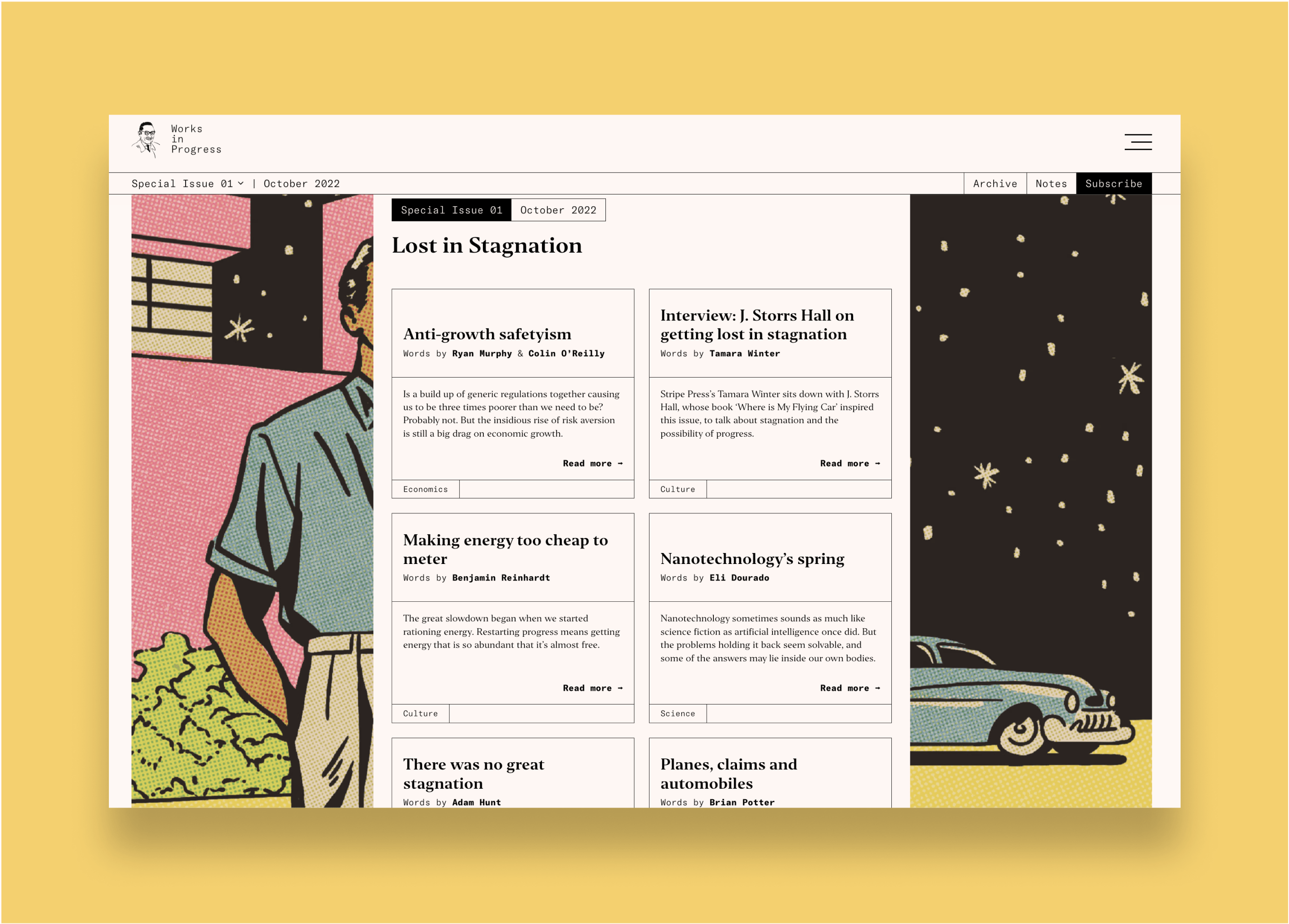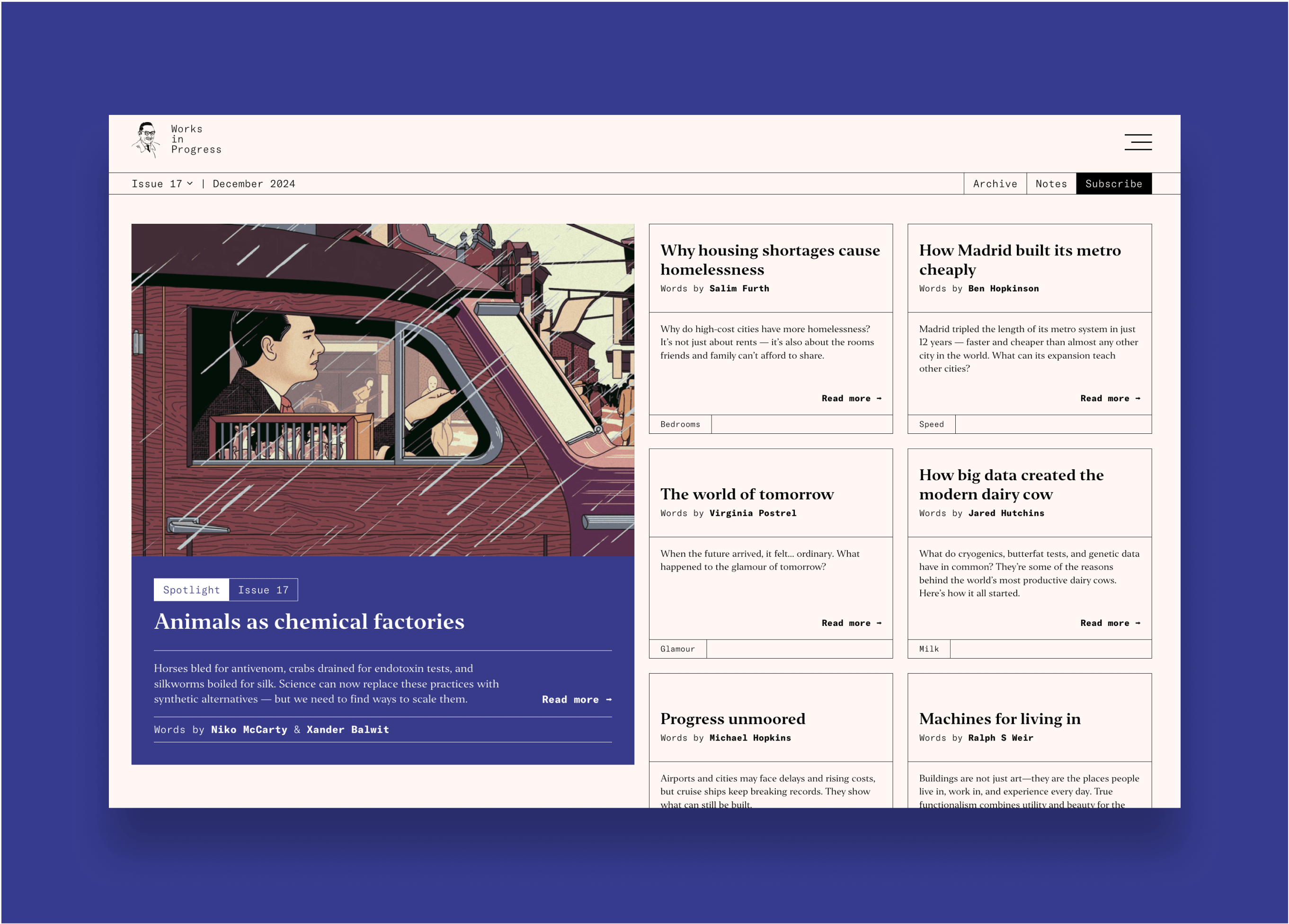 In 2020, we launched the first iteration of the Works in Progress website, and after a complete relaunch in 2023, the core design philosophy remains the same. Our visual identity continues to reflect the essence of the magazine: forward-thinking, accessible, and intellectually rich. Every design choice—whether in typography, layout, or navigation—aims to enhance the user experience, inviting readers to explore the complex world of technology, policy, and societal progress.